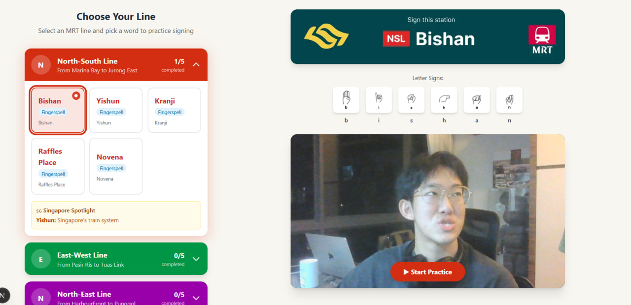 We ended up building an interactive learning game to practise American Sign Language (ASL) finger spelling, but with a very Singaporean flavour around it. We called it Hands On Track.